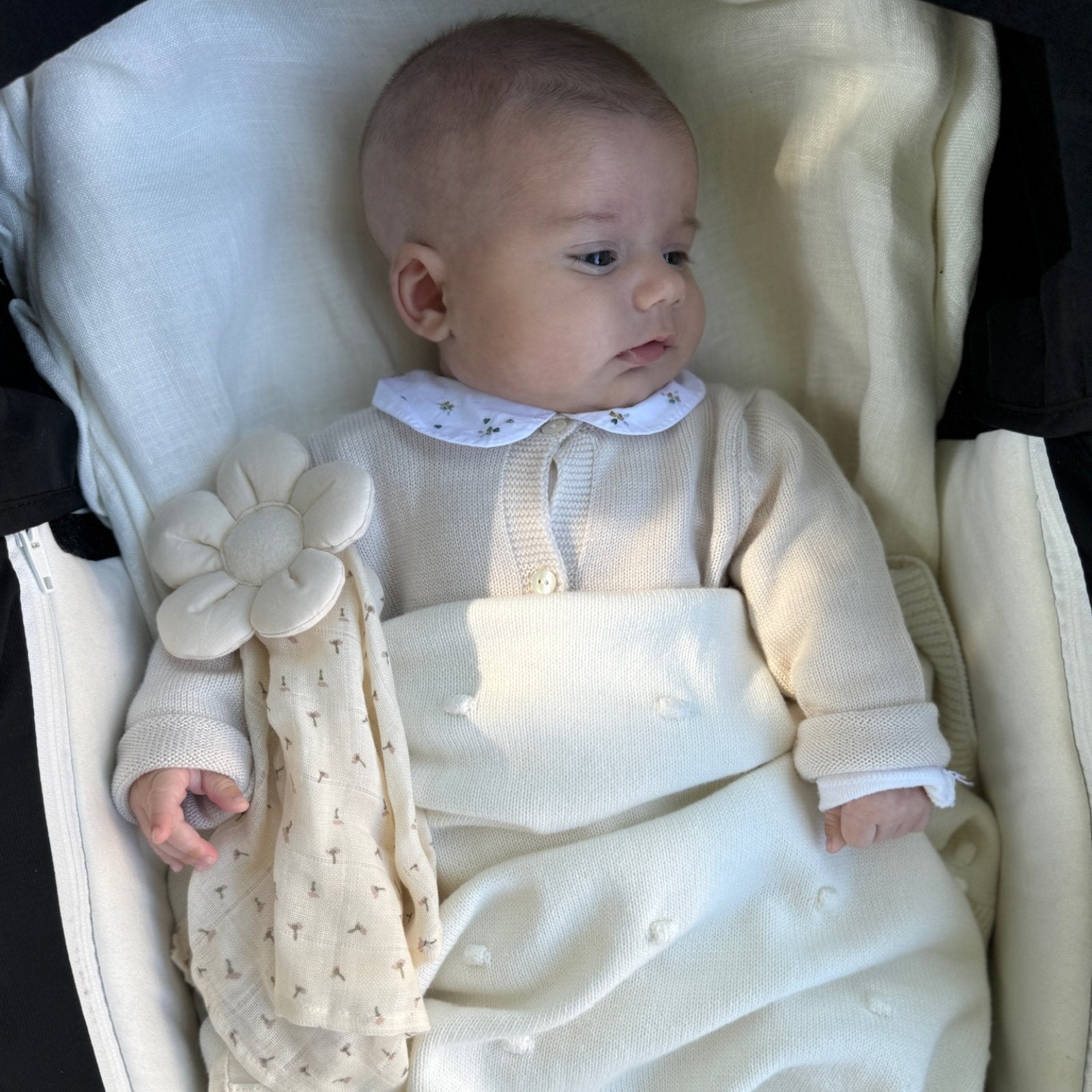 Prjónaða teppið frá Jack o June er hannað til að umvefja barnið hlýju og mýkt allt árið um kring. Það er ofið úr 100% lífrænni bómull sem andar vel og gerir teppið mjúkt og þægilegt viðkomu. Tímalaust og fallegt teppi sem hentar jafnt í vögguna, kerruna eða faðminn og er einstaklega falleg gjöf fyrir nýfætt barn.