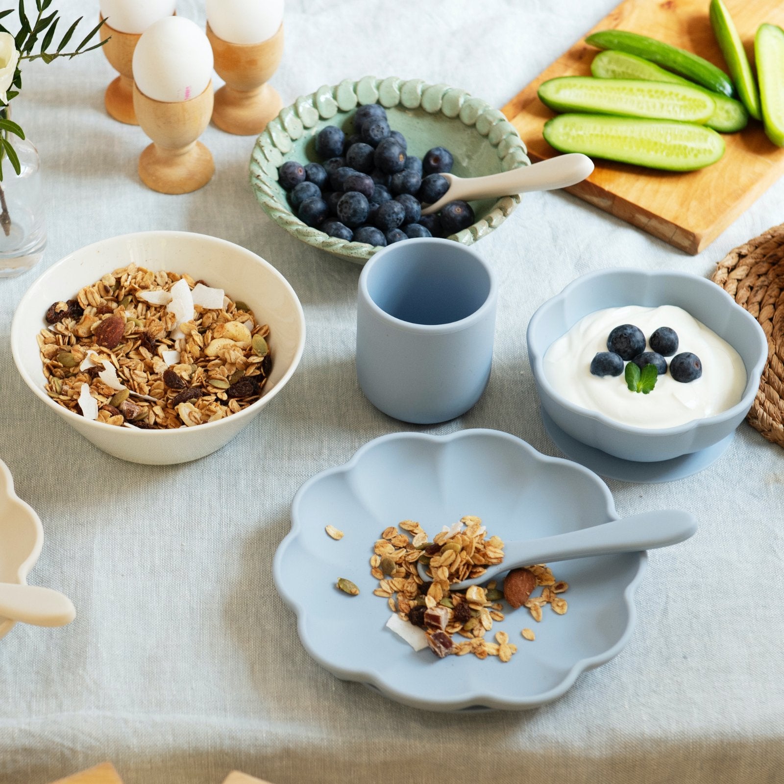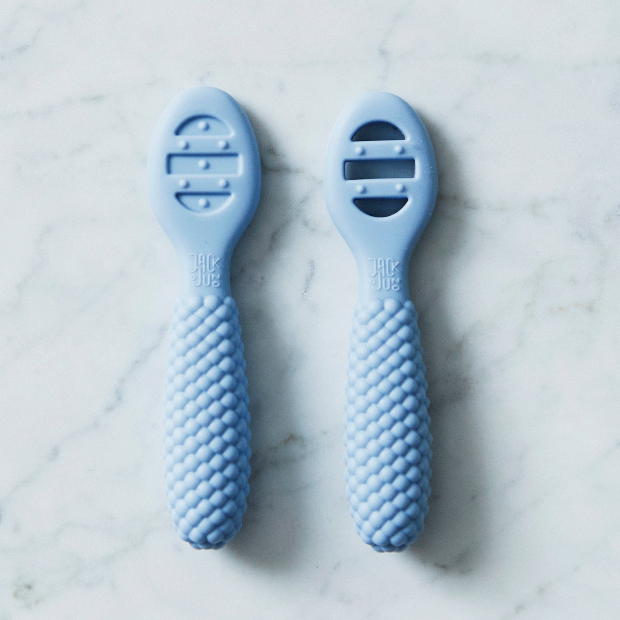 Þessar fyrstu skeiðar frá Jack o June gera máltíðir barnsins bæði auðveldari og skemmtilegri. Tvö stig hjálpa barninu að taka fyrstu skrefin í sjálfstæðu borðhaldi, fyrst með sléttri skeið fyrir mauk og síðan með opinni skeið til að ausa þykkari mat. Mjúkt sílikonið er blítt við viðkvæma góma og litlu bólurnar á hliðunum veita milda tanntökuörvun. Hönnunin er bæði leikandi og falleg, auðveld í gripi og fullkomin fyrir litlar hendur.