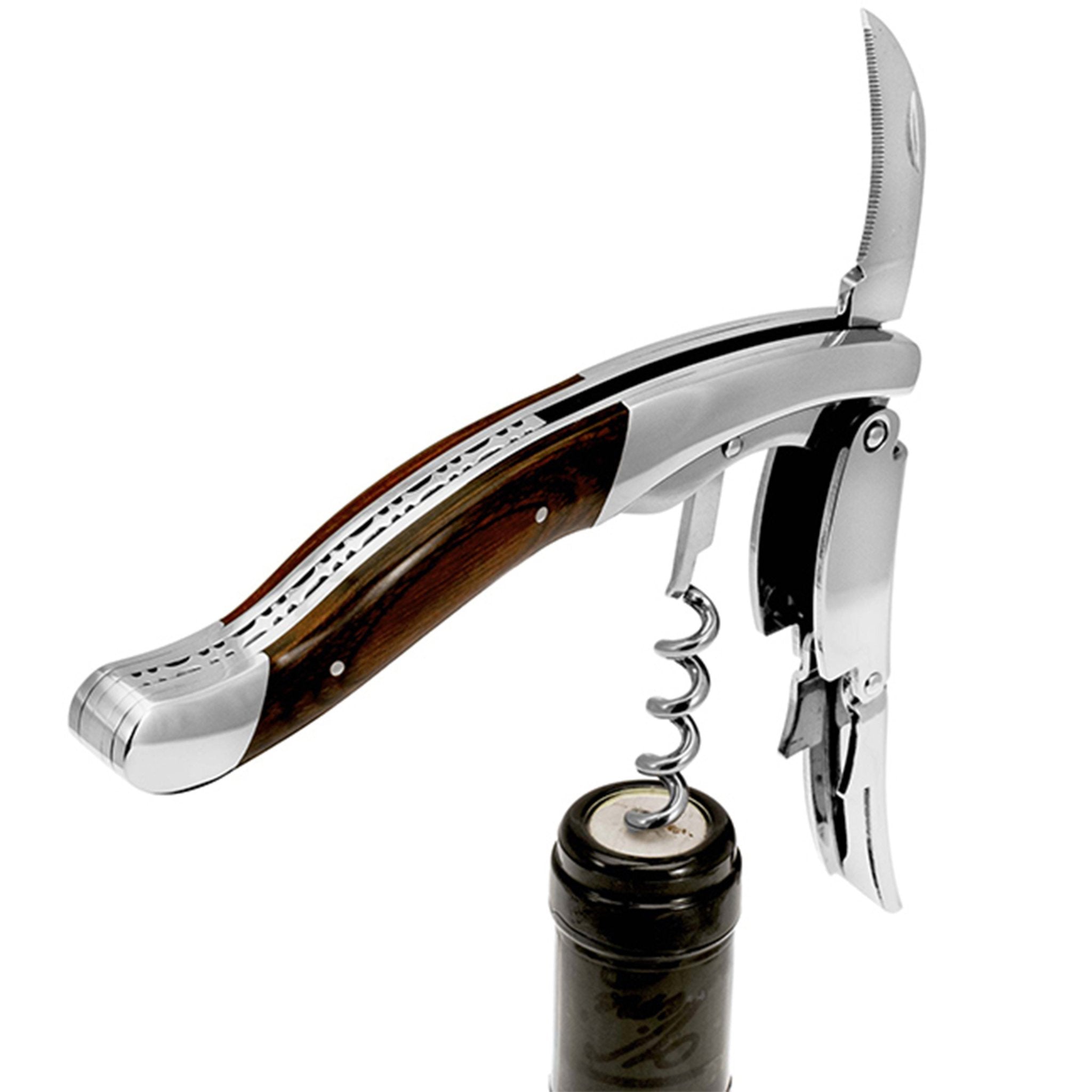 Ghemme upptakarinn frá Legnoart sameinar fágun og nákvæmni í hönnun sem höfðar bæði til fagfólks og vínunnenda. Ramminn er úr burstuðu ryðfríu stáli og handfangið úr beykivið með wengé áferð sem gefur hlýjan og náttúrulegan blæ. Tvöfaldur vogarás tryggir mjúka og örugga opnun, jafnvel á lengri tappum, og fín útskurðar smáatriði undirstrika ítalskan smekk og handverk.