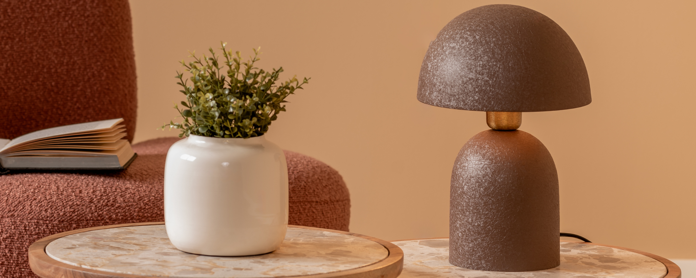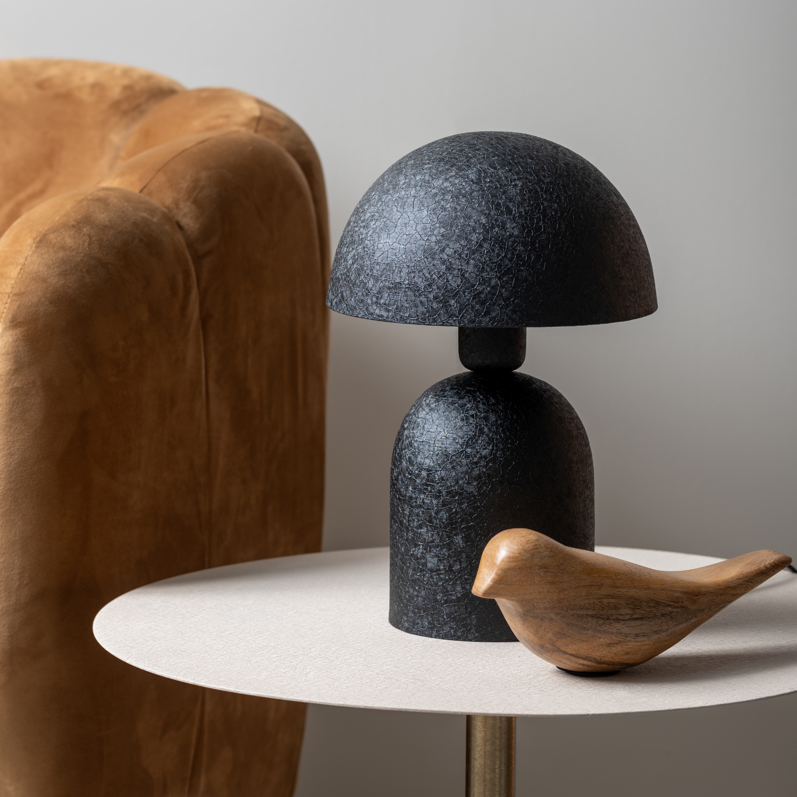 Boaz borðlampinn frá Leitmotiv sameinar einfaldleika og nútímalega hönnun í klassísku sveppalaga formi. Úr sterku járni með áferð sem gefur honum karakter og dýpt. Lampinn er 30 cm á hæð og 21 cm á breidd og passar jafnt í stofu sem svefnherbergi. Hann gefur frá sér mjúka birtu sem setur hlýjan svip á hvert rými og notar eina E27 peru (hámark 25W).