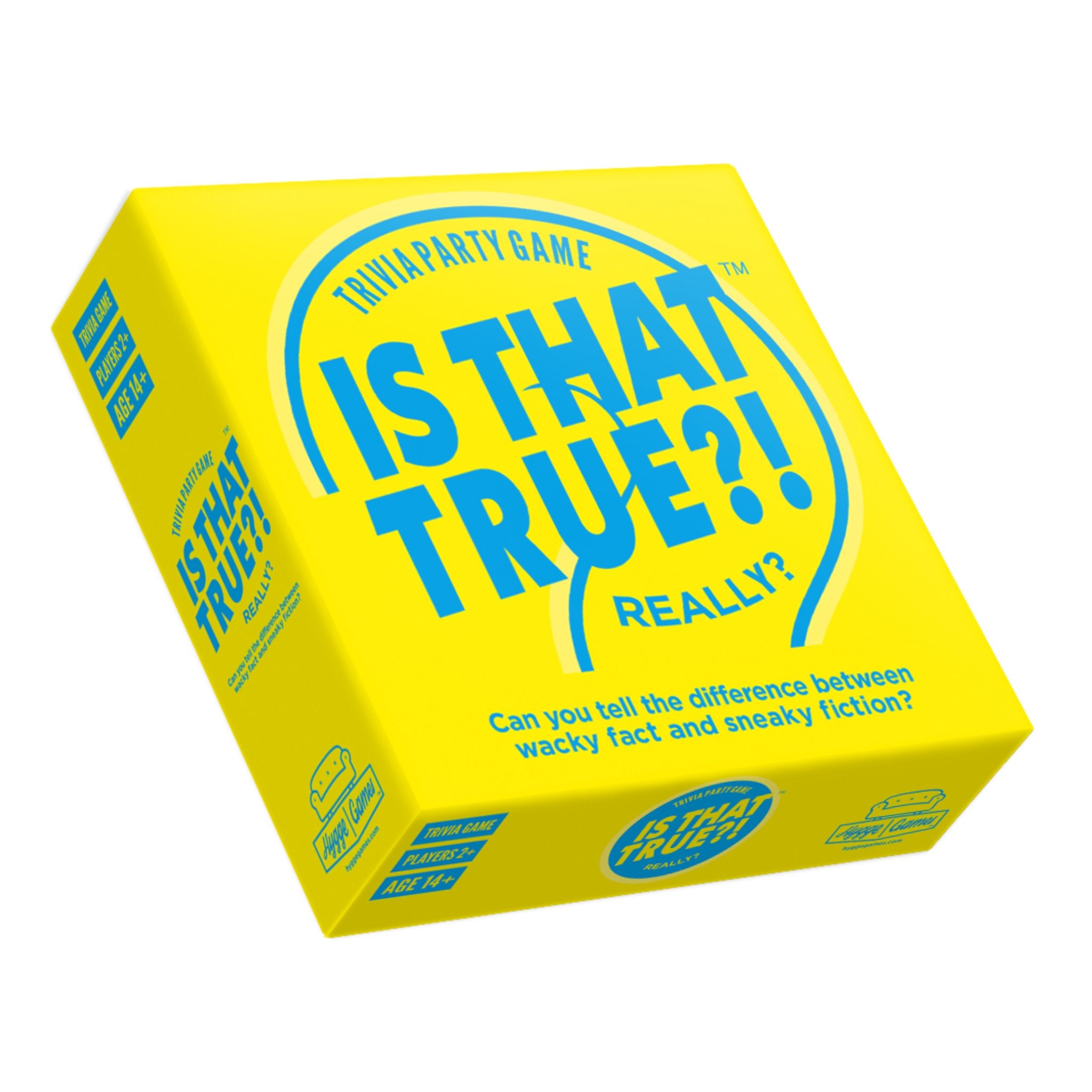 Giftnir karlmenn gefa betra þjórfé en ógiftir. Hvíta húsið er án heimilisfangs. Þvag tígrisdýrs ilmar eins og smjörpopp. Það hlýtur að vera lygi – eða hvað?! Þetta eru dæmi um spurningar í Is That True?! frá Hygge Games.