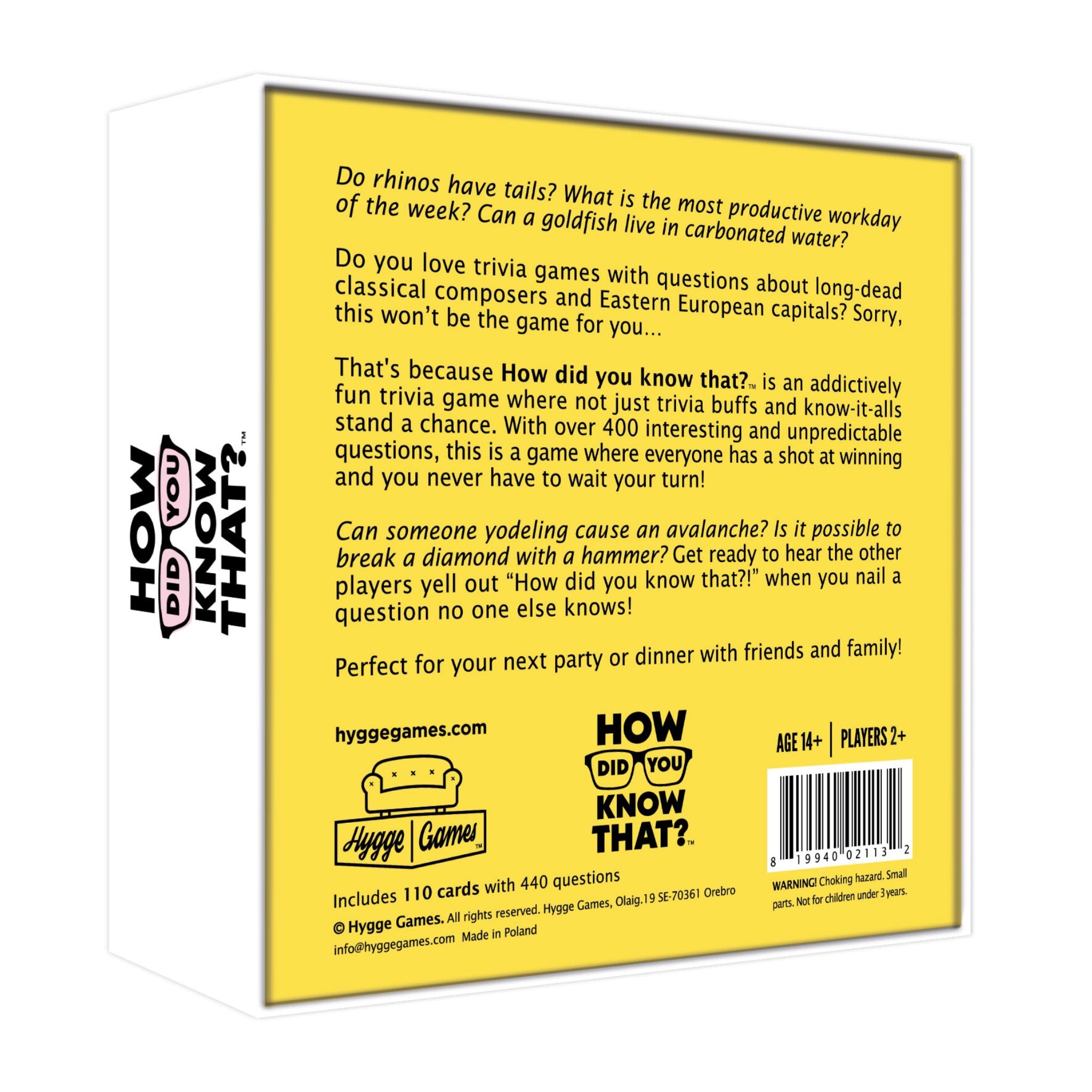 Hafa nashyrningar skott? Hvaða dagur vikunnar er talinn sá afkastamesti í vinnu? Og getur gullfiskur lifað í kolsýrðu vatni? Þetta eru dæmi um spurningar í How did you know that? frá Hygge Games.