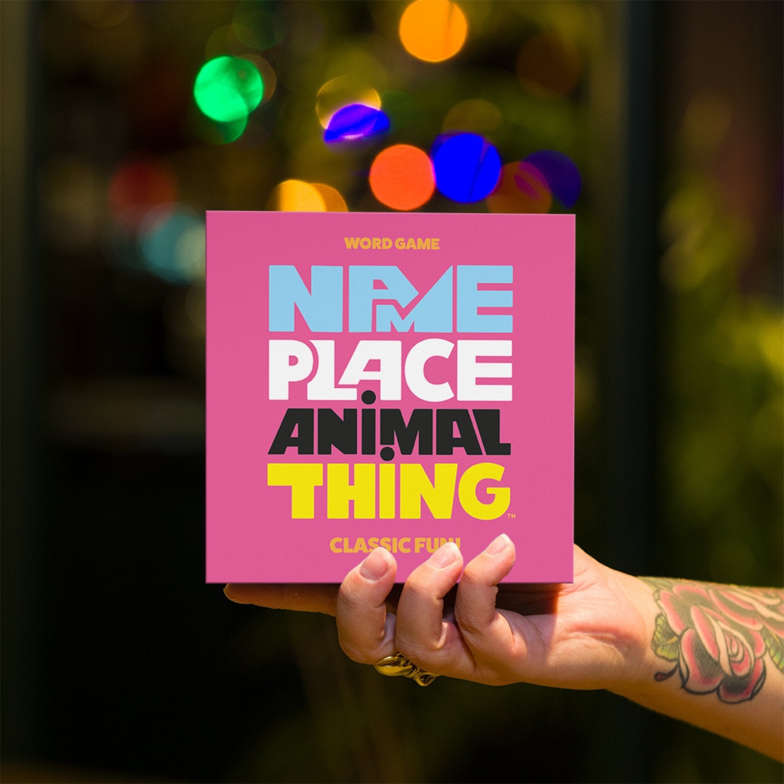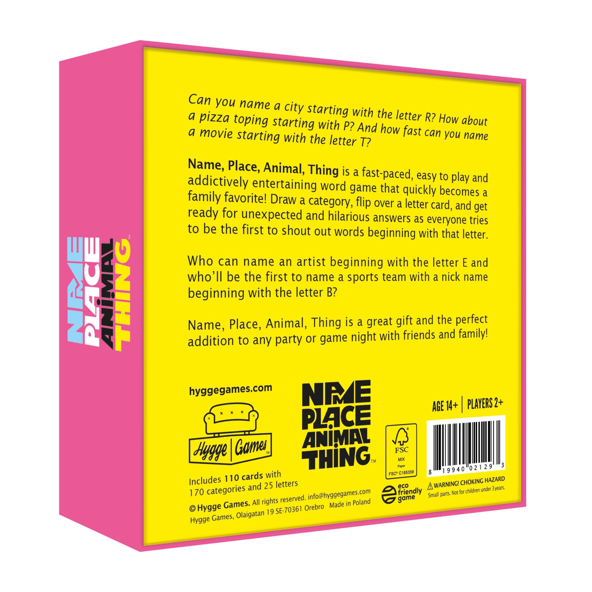 Name, Place, Animal, Thing frá Hygge Games fær alla til að hugsa hratt og bregðast við. Þegar flokkaspilið og stafaspilið mætast hefst kapphlaup um að vera fyrstur með svarið – og niðurstöðurnar verða bæði fyndnar og óvæntar. Leikurinn er einfaldur í framkvæmd en skapar endalaust spjall, hlátur og stemningu hvort sem það er á spilakvöldi, í partýi eða í rólegri fjölskyldustund.
