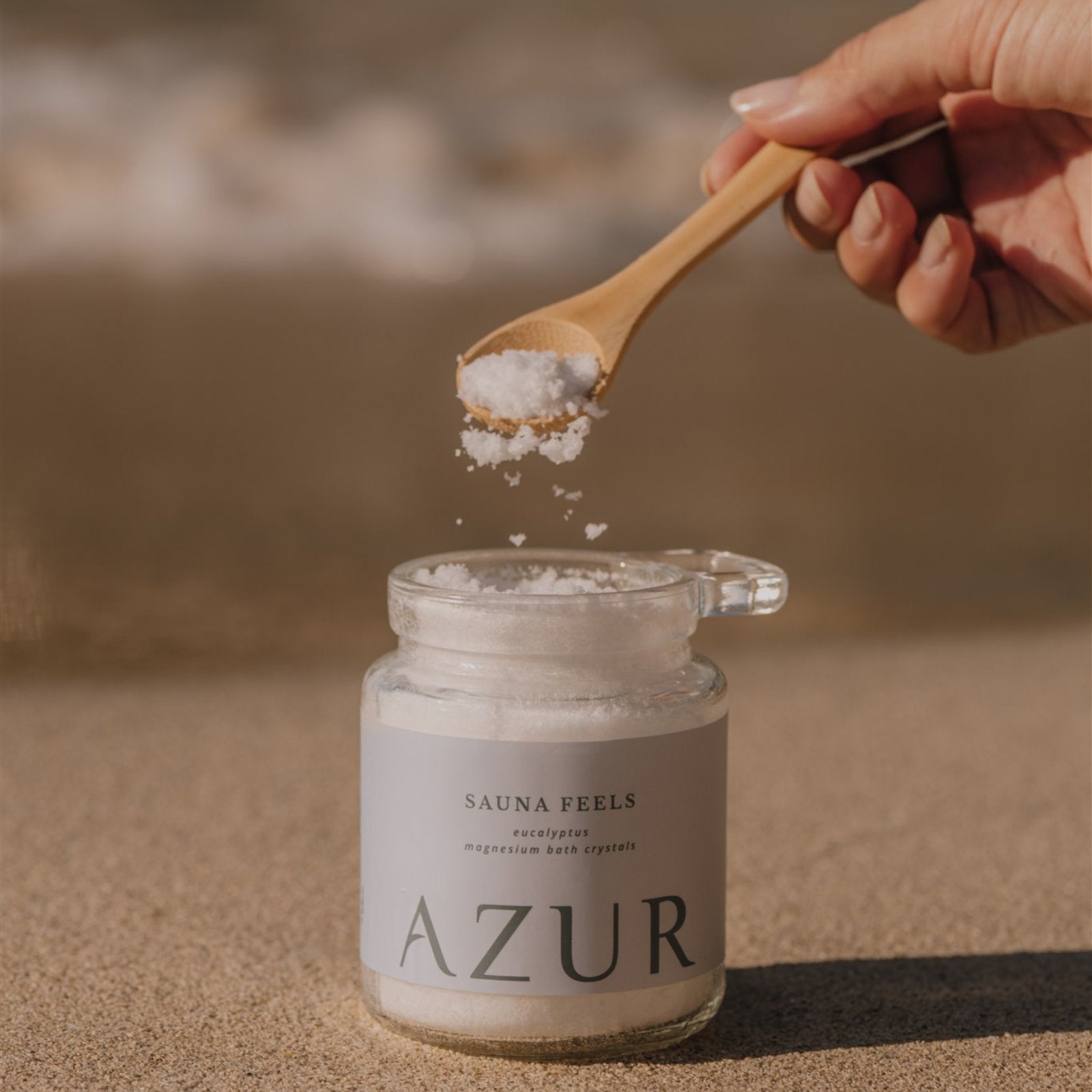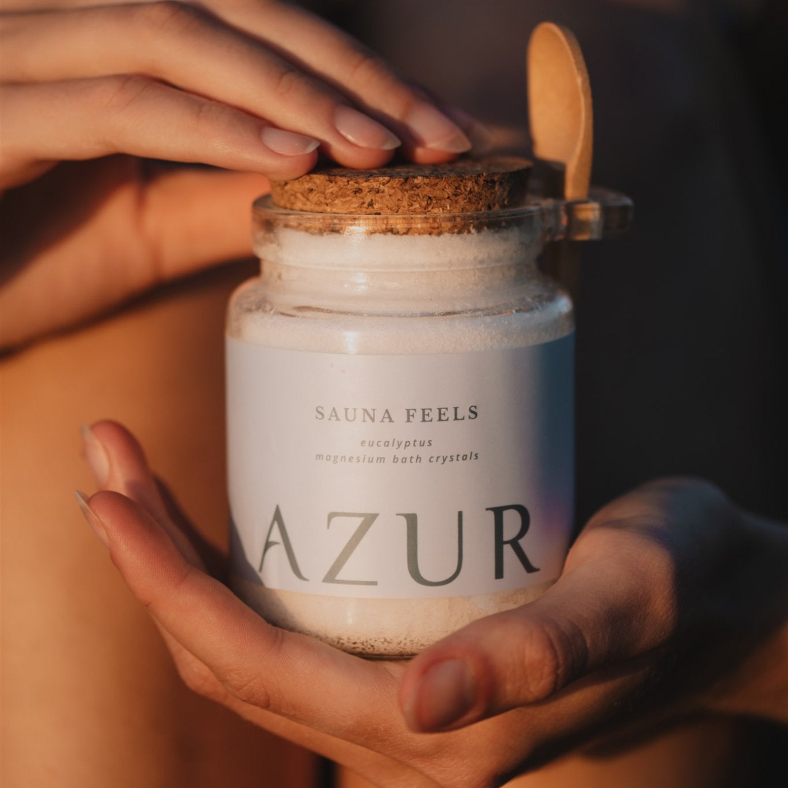 Azur Sauna Feels baðsaltið sameinar náttúrulega hreinsun og róandi ilmhjálp sem minnir á friðsælt gufubað. Það er unnið úr hreinu magnesíumsalti sem hjálpar til við að draga úr spennu í vöðvum og mýkir húðina. Nærandi möndluolía skilur húðina eftir mjúka og vel nærða, á meðan ilmur af hreinni eucalyptusolíu vekur ferskleika, hreinsar hugann og skapar endurnærandi andrúmsloft.