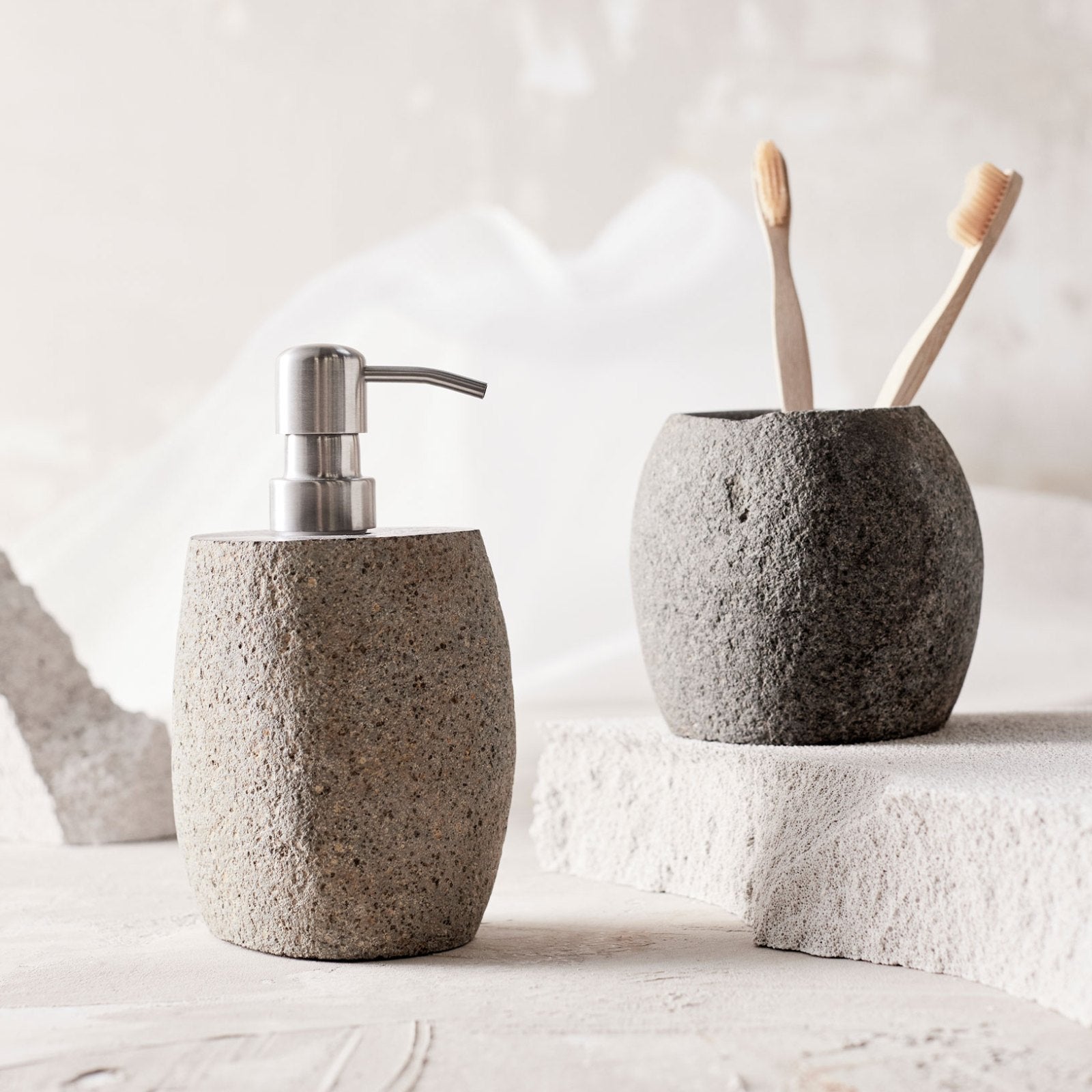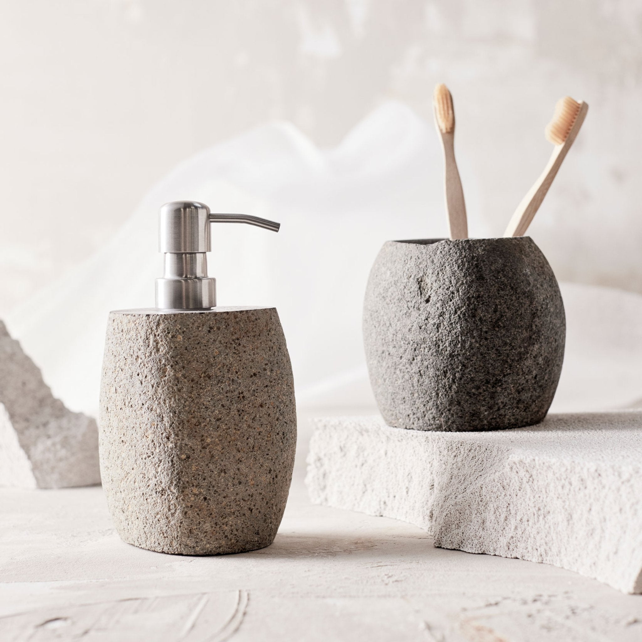 Valley sápuskammtarinn frá Muubs er úr náttúrulegum steini frá Indónesíu og gefur rýminu hlýjan og fágaðan svip. Hver hlutur er einstakur og getur verið mismunandi í lögun, lit og áferð eftir eðli steinsins. Þetta gerir hvern sápuskammtara sérstakan og með eigin karakter.