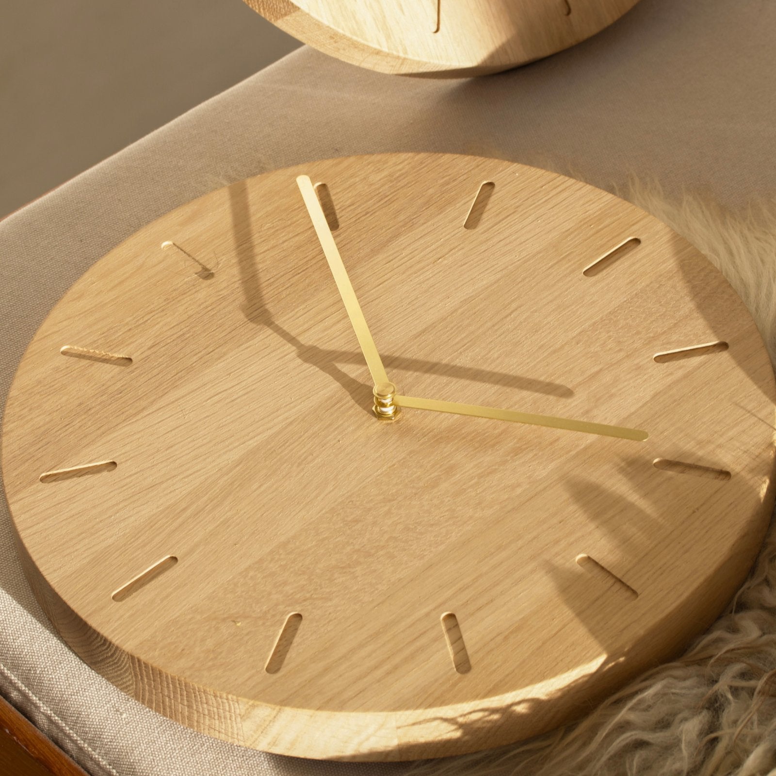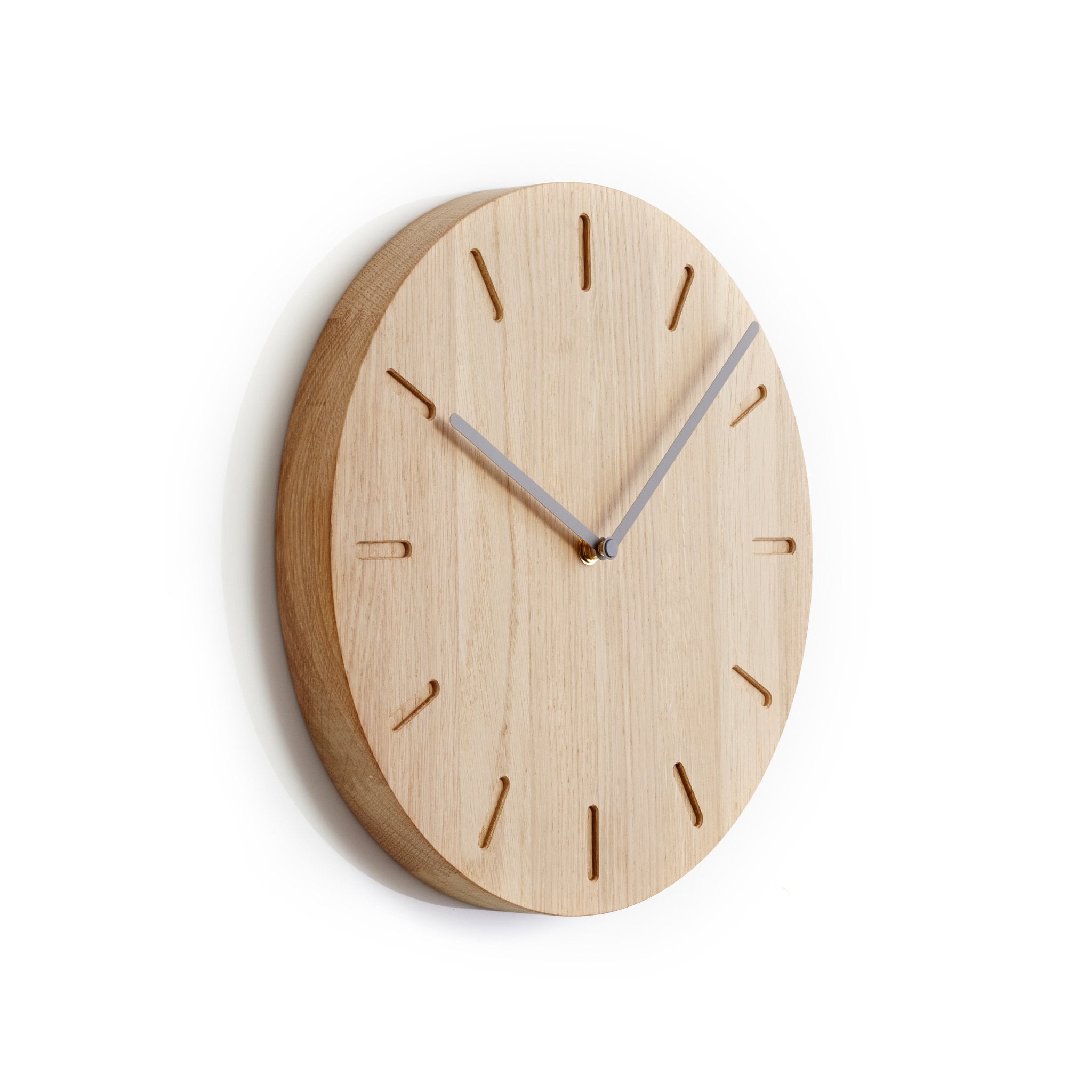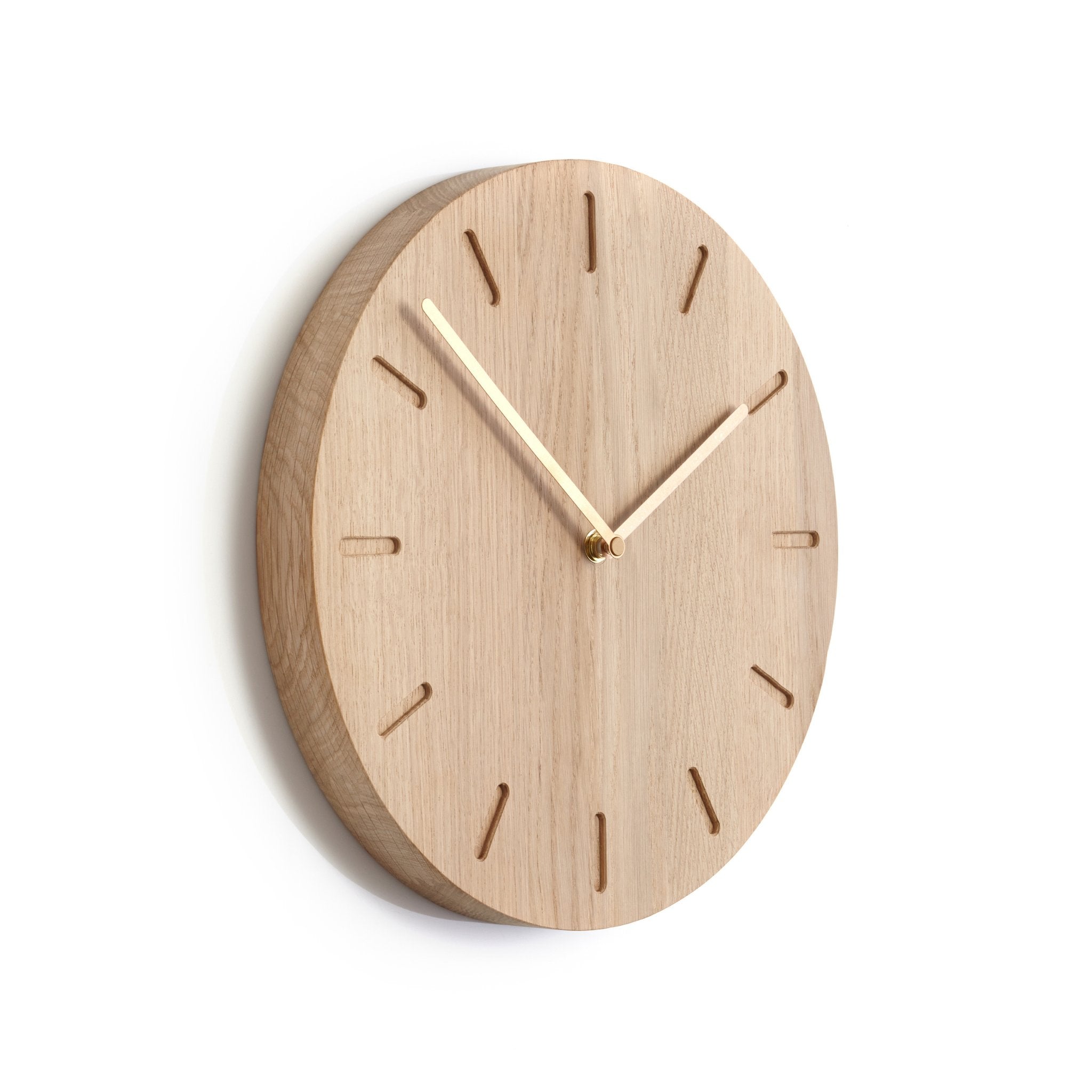 Klukkan er unnin úr FSC-vottaðri eik og framleidd í Skandinavíu af verkstæðum sem leggja áherslu á gæði og sjálfbært handverk. Hún er 32 cm í þvermál og fáanleg í mismunandi útfærslum þar sem velja má á milli ólíkra áferða. Hvort sem hún er hengd upp í eldhúsi, stofu eða skrifstofu setur hún stílhreinan svip á rýmið.