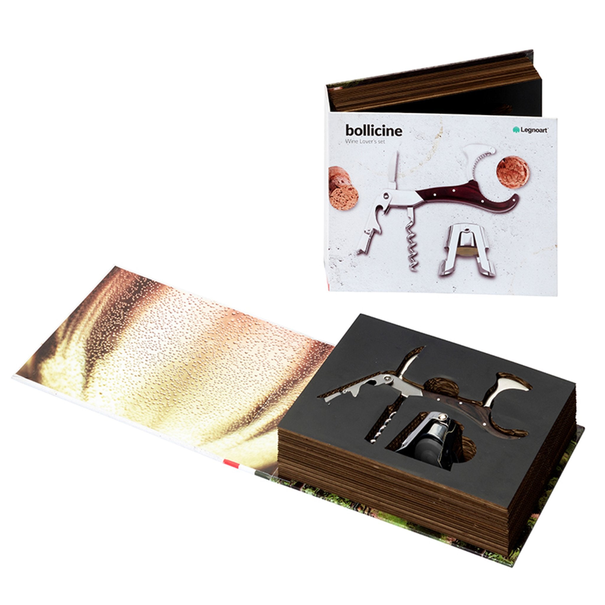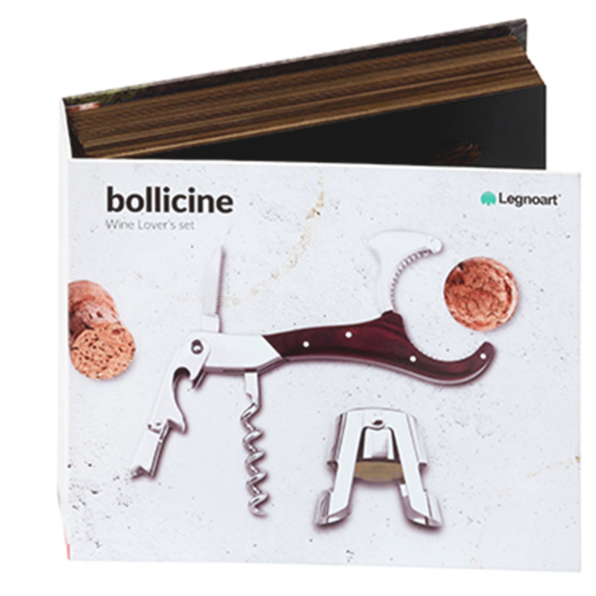 Vínáhugamannasettið Bollicine sameinar ítalska hönnun og fagleg vinnubrögð í einstaklega fallegu safni. Settið inniheldur 4-í-1 vínaopnara með kampavínstöngum, hníf til að skera filmu og upptakara. Einnig fylgir kampavínstappi úr stáli með sílikonþétti sem heldur loftþéttni og ferskleika. Handfangið er úr náttúrulegum við og hvert smáatriði er unnið af nákvæmni til að tryggja jafnt notagildi og glæsilegt útlit.