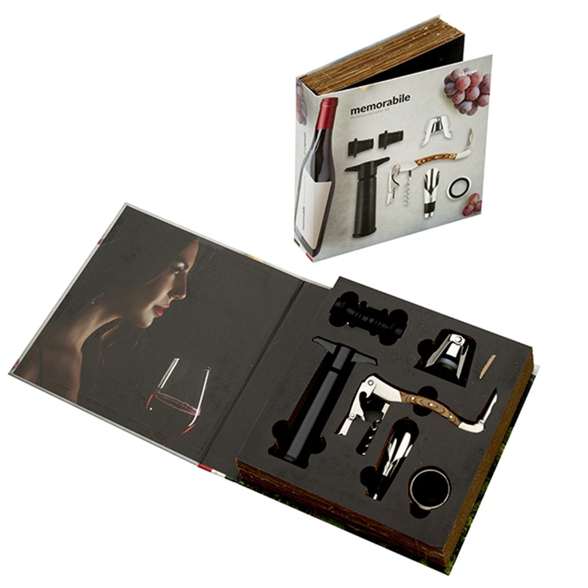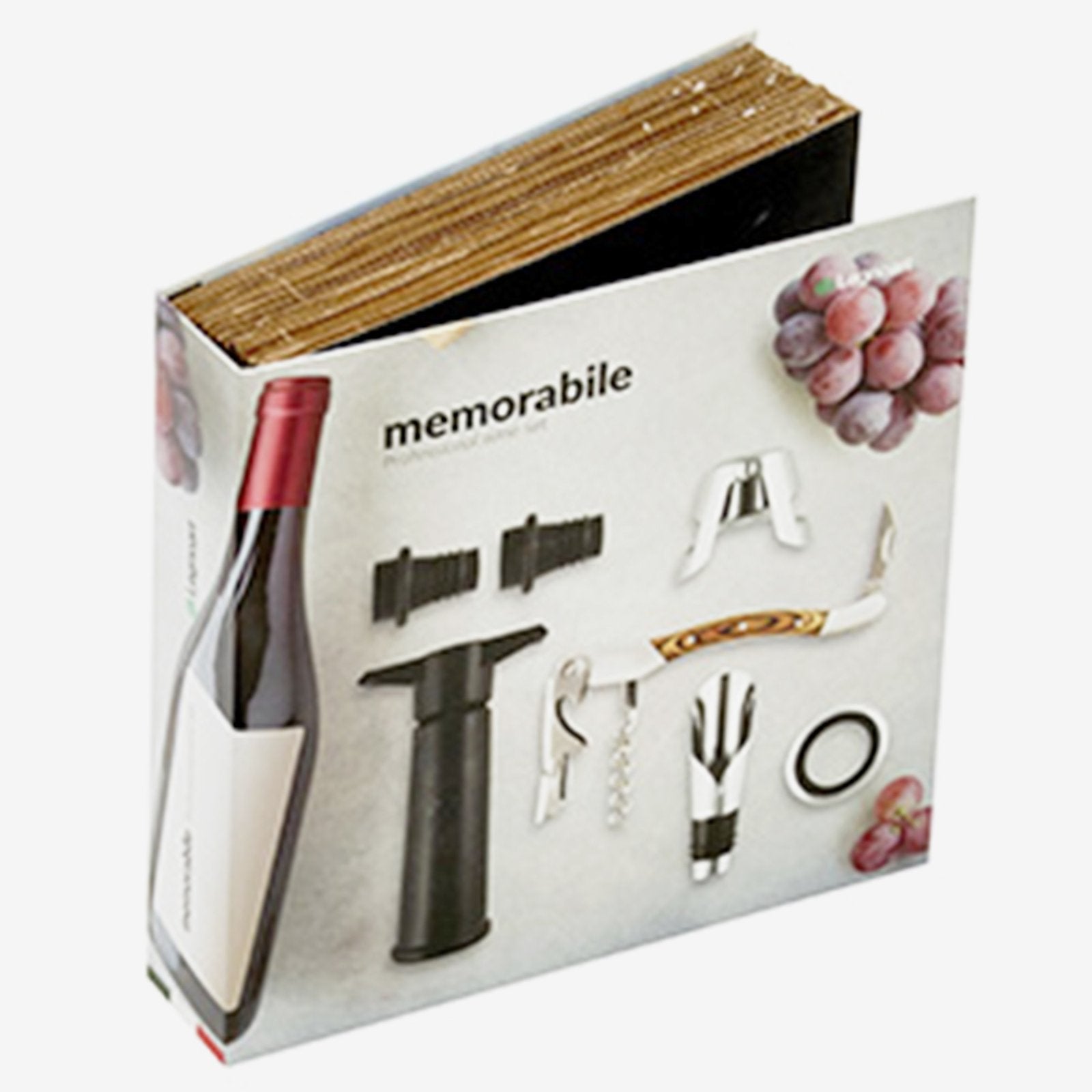 Memorabile Grand Cru vínsettið sameinar ítalska fagurfræði og vandaða notkun. Í settinu er upptakari, kampavínstappi, dropphringur, hellistútur fyrir vín og loftdæla með tveimur kísiltöppum. Allt kemur í bókalaga öskju sem lyftir gjafastemningunni og heldur hlutunum snyrtilegum á heimilinu.